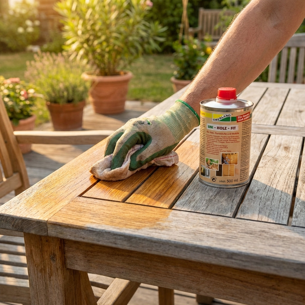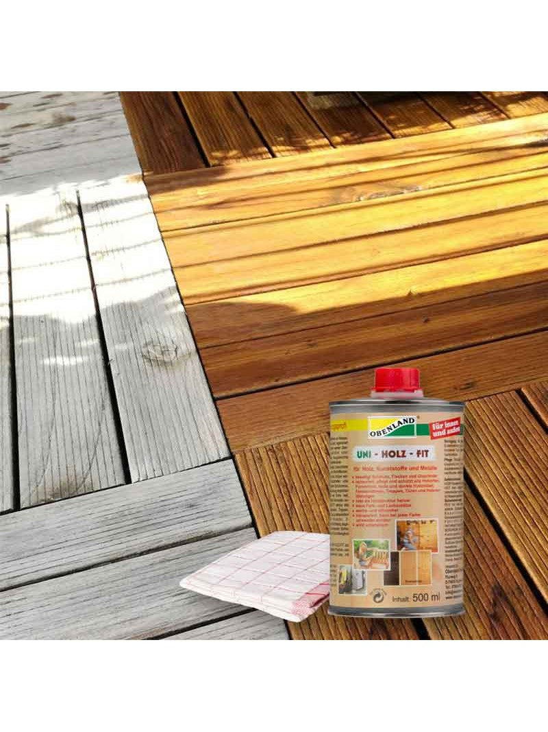 Innenbereich: Entfernt Ausbleichungen, Grauschleier und Putzstreifen, beseitigt Wasser- und Alkoholflecken, regeneriert und restauriert Holz und Lacke. Kratzer werden überdeckt. Putzstreifen, Schmutzstreifen oder Fingerabdrücke werden beseitigt. Entfernt Schuhcreme, Absatzstriche und Teer. Nicht empfohlen zur Anwendung von künstlich gebleichten Hölzern wie Eiche hell, Senesche und sandgestrahlten Hölzern! Ansonsten reinigt und pflegt Obenland® Uni-Holz-Fit nahezu alle Holzoberflächen wie Türen, Küchenschränke, Tische, Stühle, Schränke, Treppen, Schnitzereien und Bauernmalereien. Reinigung/Auffrischen: Mit getränktem Baumwolllappen satt auftragen. Bei Erstbehandlung ca. 2-3 Stunden einwirken lassen. Wenn nötig mit einem trockenen Tuch abwischen (Schmutzteile werden mit entfernt). Nicht nachpolieren.